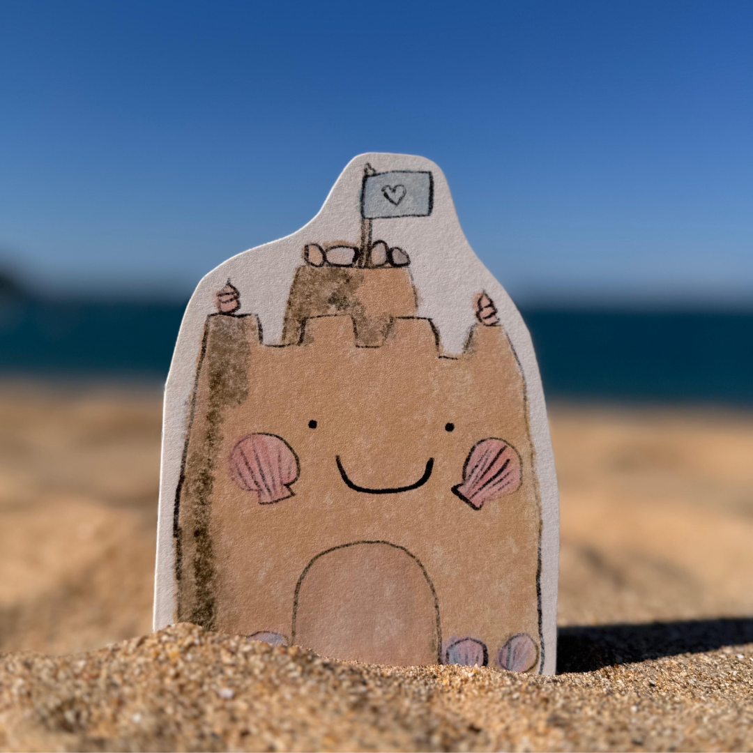 Cette carte en forme de château de sable sent bon les vacances ! Avec ses coquillages roses en guise de petites joues, son drapeau à cœur et son grand sourire, il évoque instantanément la douceur de l'enfance et les étés ensoleillés au bord de la mer.