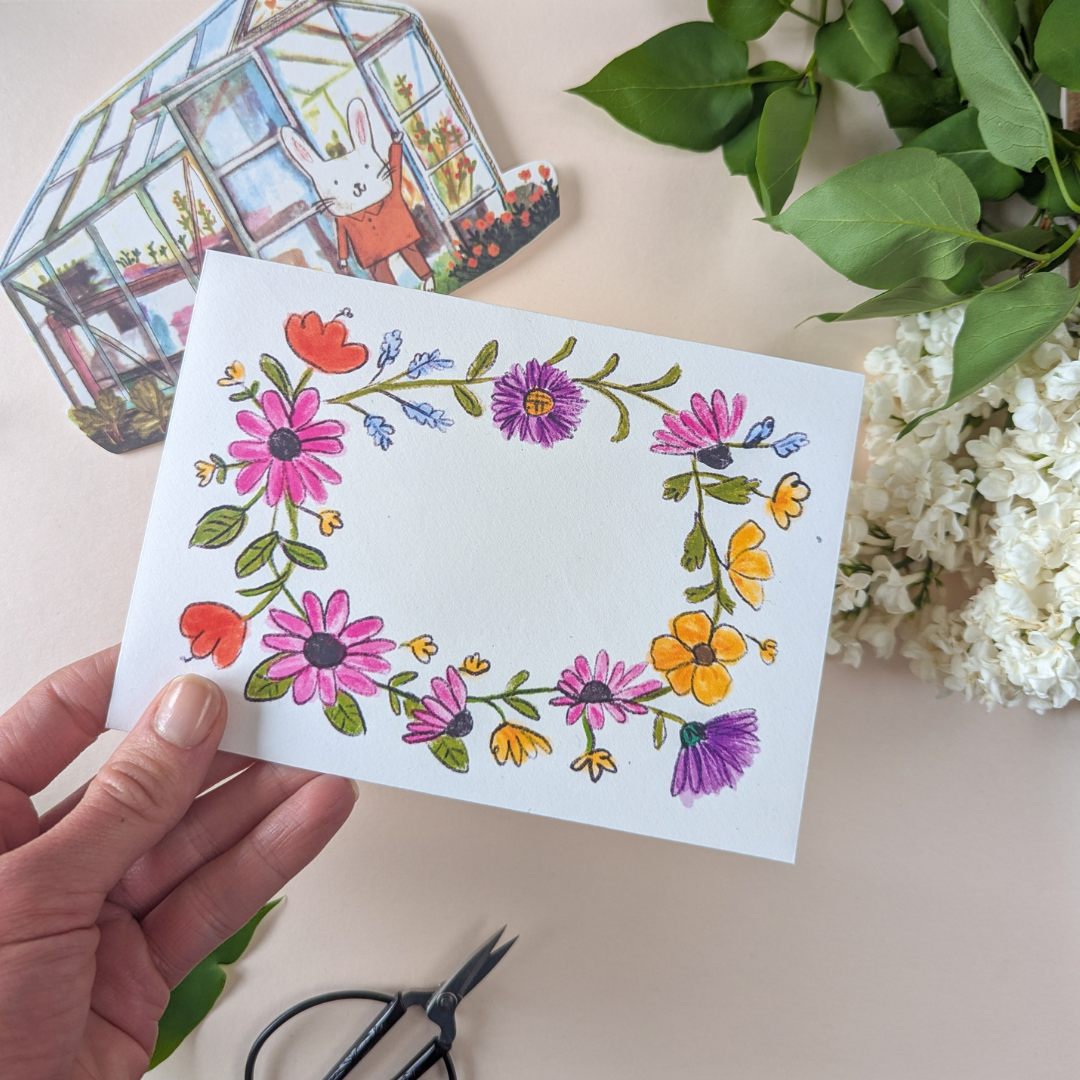 Faites éclore un sourire avec cette carte tout droit sortie d’un jardin enchanté ! Une jolie serre abrite un petit lapin malicieux qui vous salue chaleureusement parmi les fleurs. Une scène pleine de douceur pour célébrer le printemps, une amitié ou simplement faire plaisir.