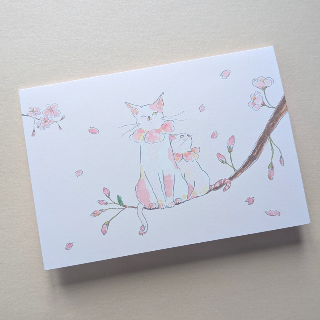 Une carte pleine de douceur inspirée du printemps japonais. Sur le devant, une maman chat et son petit sont délicatement posés sur une branche de cerisier en fleurs.