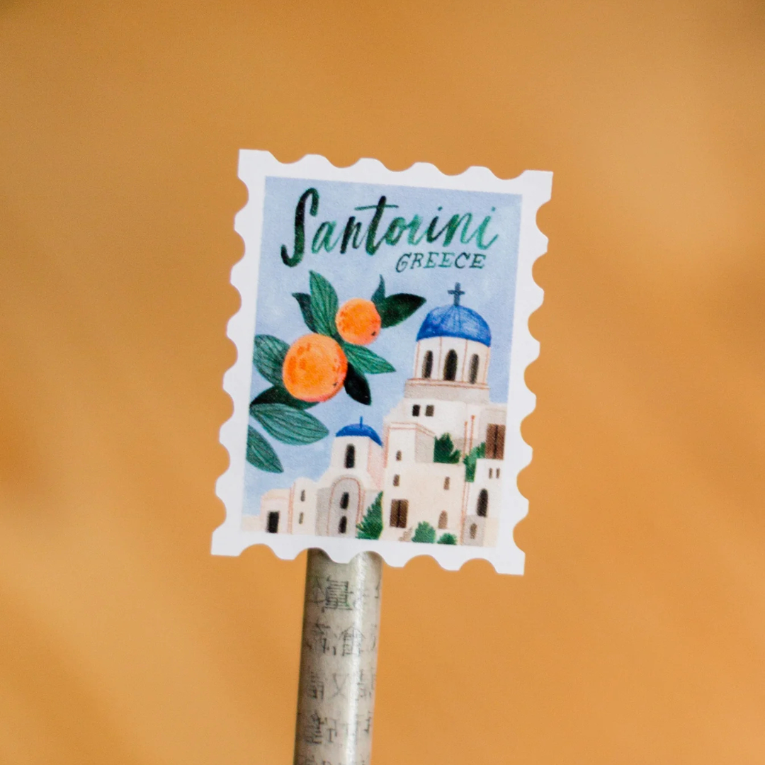 Découvrez la planche de stickers " Timbres de voyage " illustrée par Magdalena Konečná, qui évoque des destinations emblématiques : les falaises d’Irlande, les toits bleus de Santorin, les montagnes des Alpes, les cascades d’Islande et bien d’autres paysages qui donnent envie de s’évader.