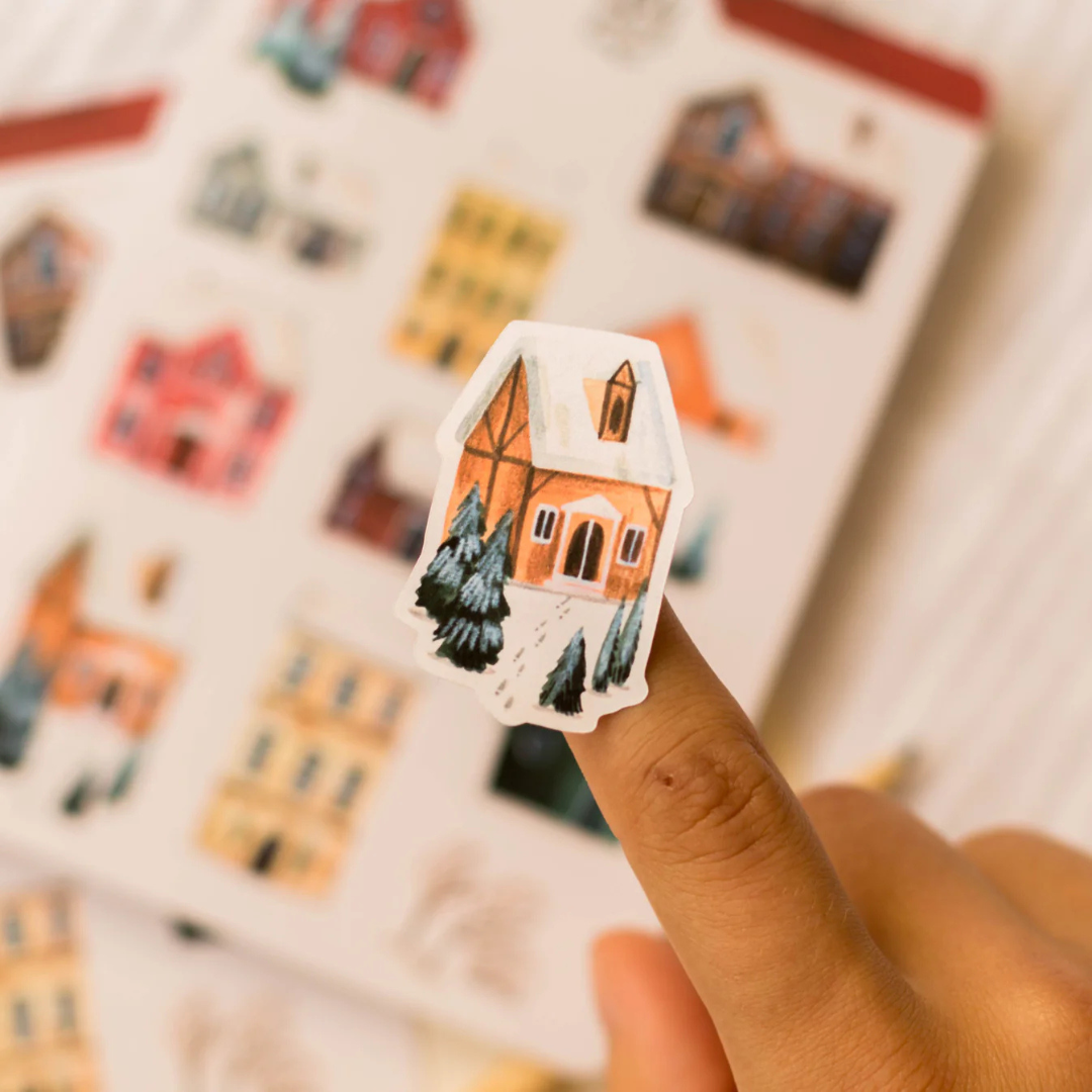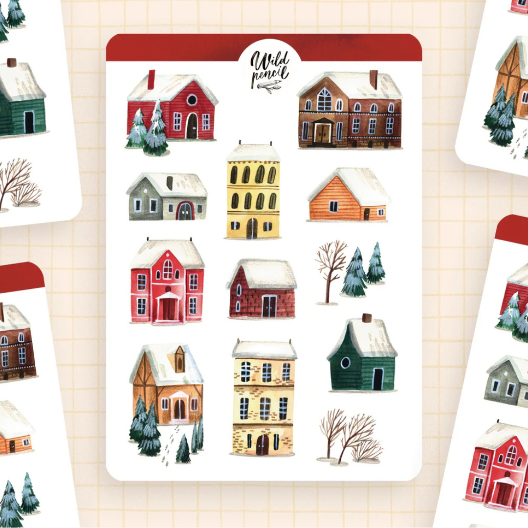 Cette planche de stickers regroupe une adorable collection de petites maisons aux toits poudrés de neige.